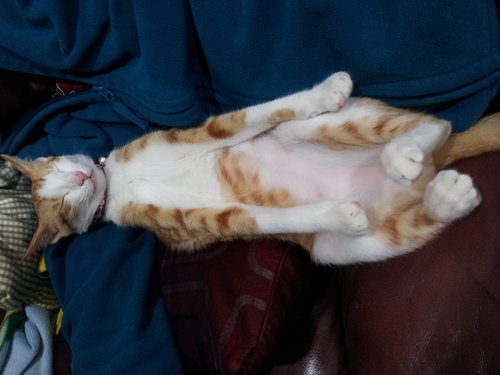 書上說貓的睡眠時間一天大概十幾個小時,小花只要一窩在人身上就睡覺,睡覺的姿勢也千百種!